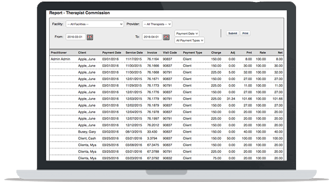Our therapist commission report shows line-by-line what what each of your independent contractors have charged and what’s been paid. Then it totals the payments based on the commission rates you set so you know exactly what you owe each contractor for any pay period.