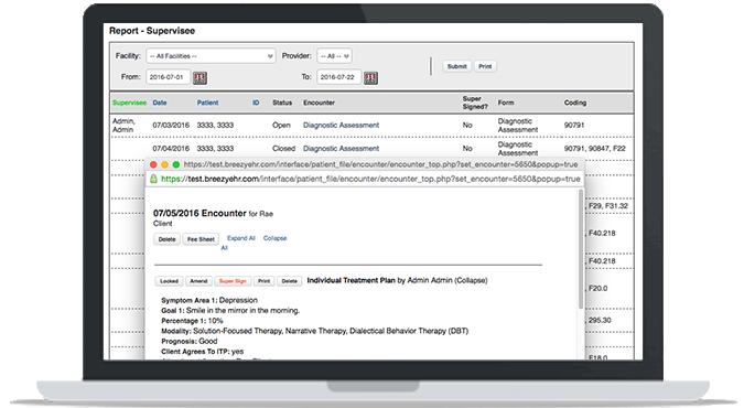 Sign off on supervisee notes without hassle or worry. The supervisee report shows you all your supervisee’s notes in one place, where they’re ready to be super-signed by you. At the same time, BreezyNotes EHR gives you full control over whether supervisees can submit claims, view other clients, and access virtually any part of the software you choose.