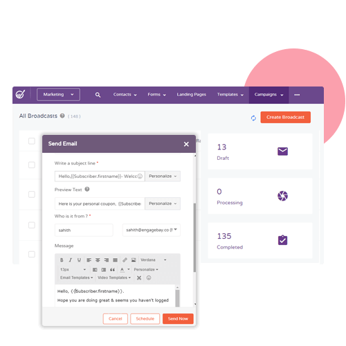 - EngageBay helps you personalize your emails by adding your contacts' attributes to the emails, rendering a personal touch. You can choose from their First Name, Last Name, Full Name or email address. These details will be auto-filled when the email is sent. Personalize your outreach!