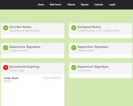 Make sure all treatment notes are completed and signed. Once therapist logs into eTherapyDocs, the login dashboard provides feedback to the user alerting of situations where treatment notes have not been completed, there are notes with pending co-signatures, and if there are any expiring patient documents that require attention. Administrators have the same alerts with visibility to all therapists and patients within the practice.
