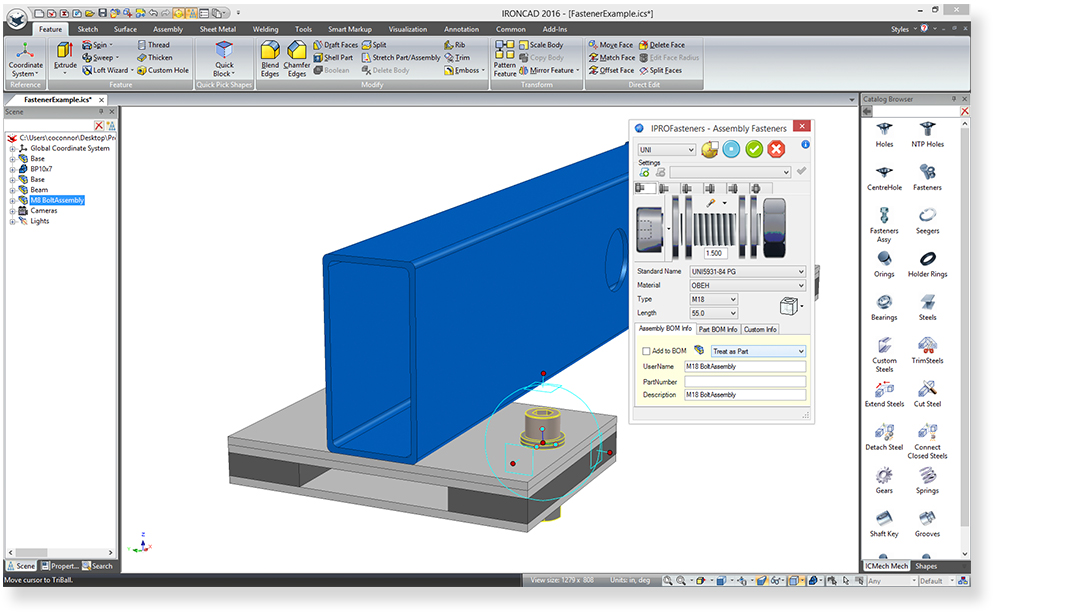 IronCAD Mechanical also comes with a number of additional time-saving features for fabricators, including a tool for creating parametric holes and recesses that can then be saved in catalogs for repeated use; shape utilities that toggle parts from solid to negative; a visual database of materials that can apply different densities to parts or assemblies; and many more.