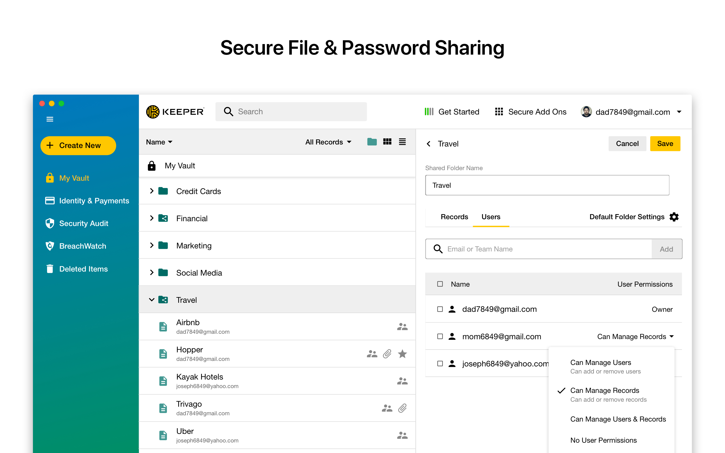 Simply tap the "Share" button from your vault and invite your partner or co-worker to view the file. Using public/private key encryption + 256-bit AES, Keeper shares passwords and files securely from Vault-to-Vault.