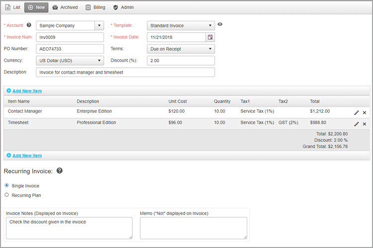 An Invoice is a written agreement between the buyer and seller which specifies the details of the goods or services purchased. It usually consists of the Invoice number, PO number, item name, description, quantity, cost, etc. OfficeClip contact management software helps you to create and send invoices easily to your customer.