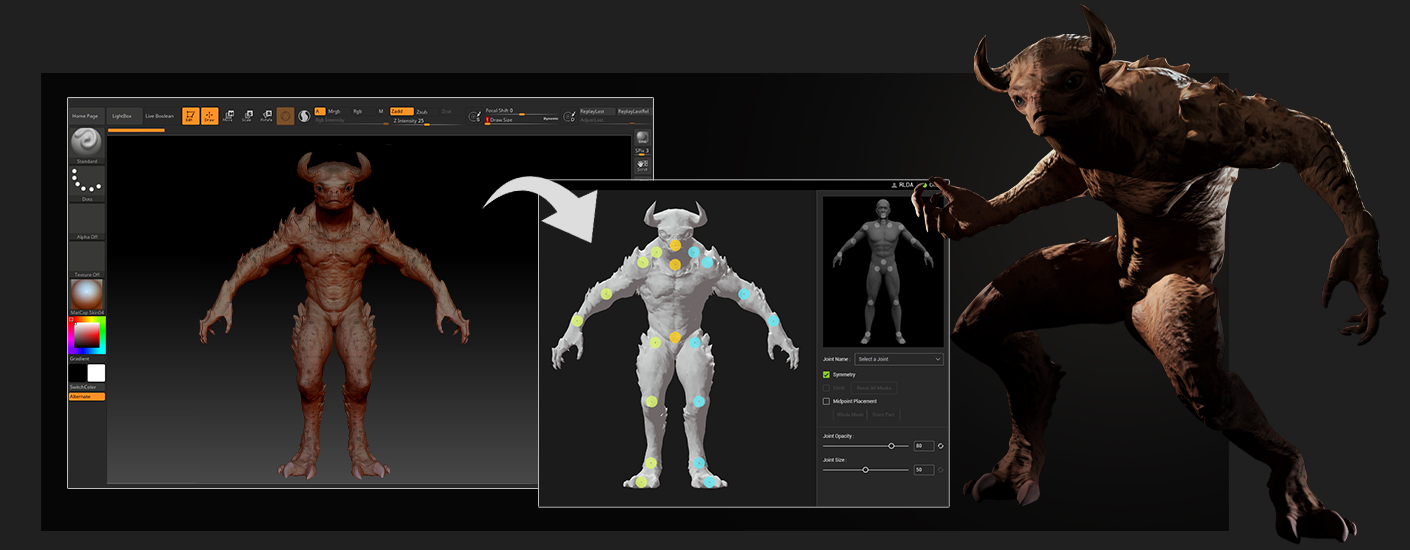 Showcase concept art and digital sculptures made with ZBrush and Blender, by converting un-rigged statues into animation-ready characters. Speed up the sculpting-to-animation process with AccuRIG’s auto rigging and manual joint refinement that will level-up character value and versatility.