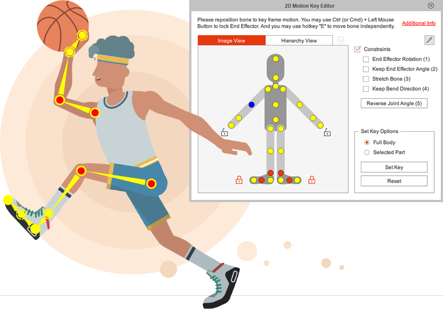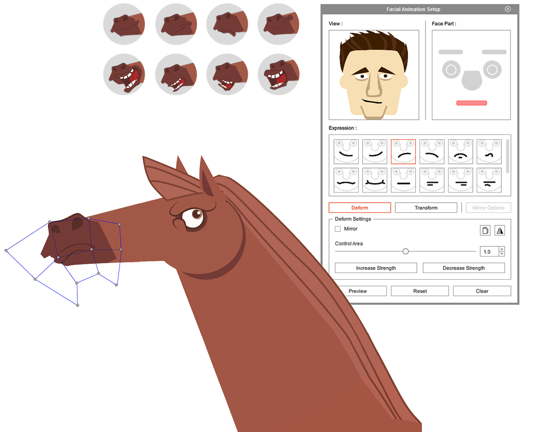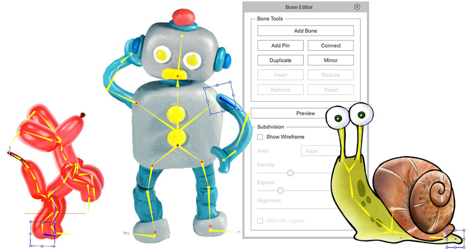 Cartoon Animator 4 enables artists, illustrators, cartoonists and designers to easily create animatable 2D characters from static images, photos, paintings, and even layered Photoshop PSD. The 2D Bone Editor has all the tools to successfully structure sophisticated bone rigs. Users can use pins to constrain areas to selected bones and optimize subdivision topology for smoother bending effects. Save effort on custom bone-rigging and key frame animation by providing full facial and body rigged character templates allowing users to utilize shared bones structures while enjoying a huge library of cartoon motions.