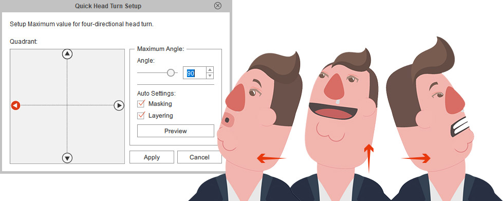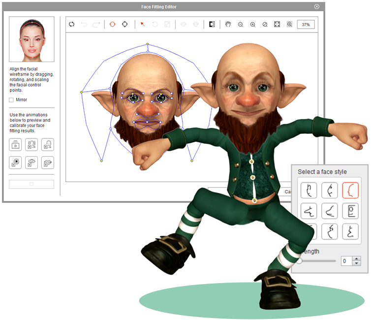 3D Head Creator of Cartoon Animator 4 transforms 2D art into 3D styled characters with up to 360 degree of motion for deeply rich performances. Photoshop round trip integration for editing multi-angle character in and out of 3D Head Creator.