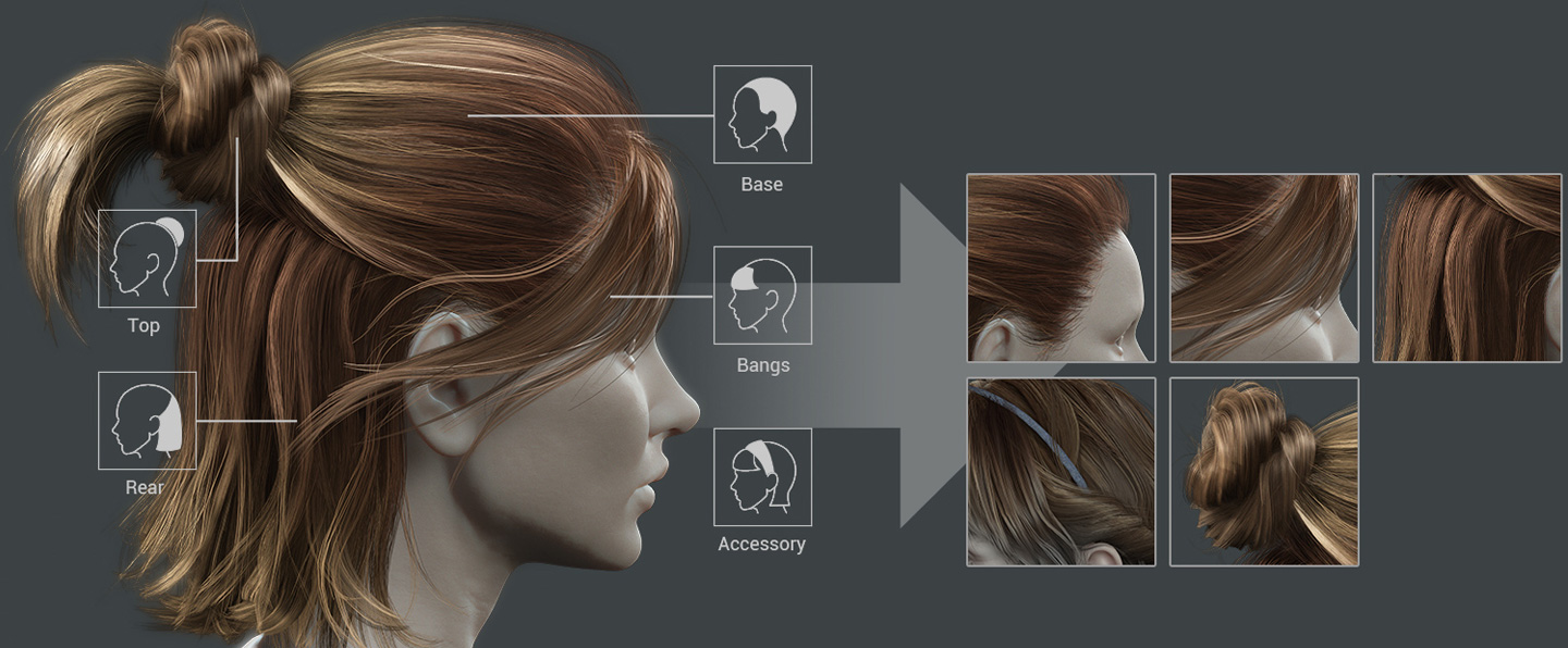 The embedded Smart Hair system is designed to provide the most realistic yet performance-friendly Hair, Brows, and Beard for digital humans in games and films. The card based hair meshes are small in size, economical in texture resolution, and efficient for real-time rendering. The highly flexible ombré color gradients and specular variation are empowered by the Smart Hair Shader. The Component Design allows you to freely assemble different hair, and beard elements into unique hairstyles. The beard and brows can dynamically conform to any facial movements.