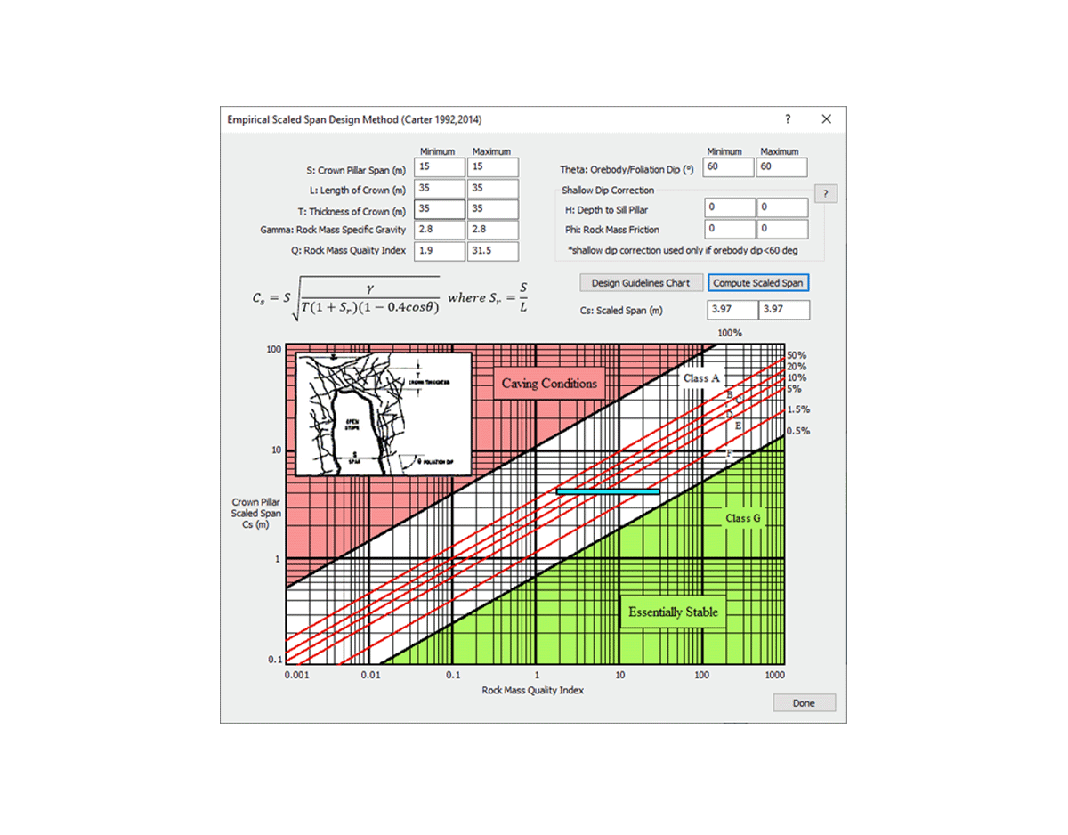 Originally developed for steeply dipping ore body geometries, by estimating crown geometry and assessing the stope geometry as steep or shallow, you can apply the most appropriate empirical relationships to your model.