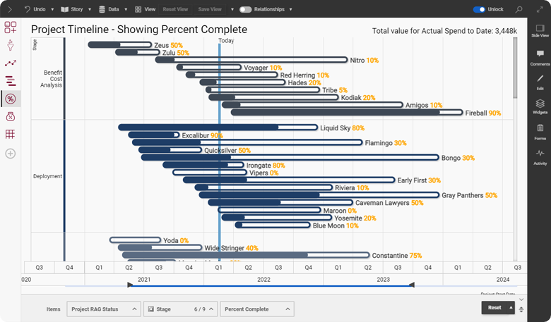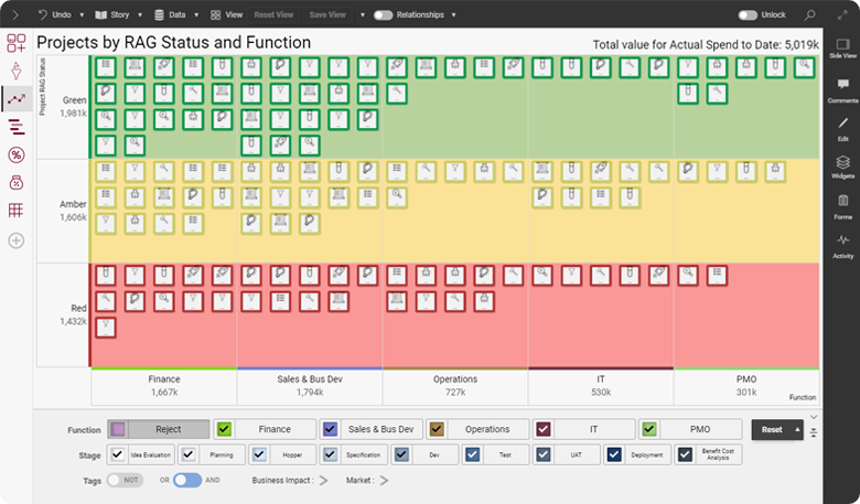 Visualize, survey, and scrutinize plans and actions together and see how innovations affect other projects