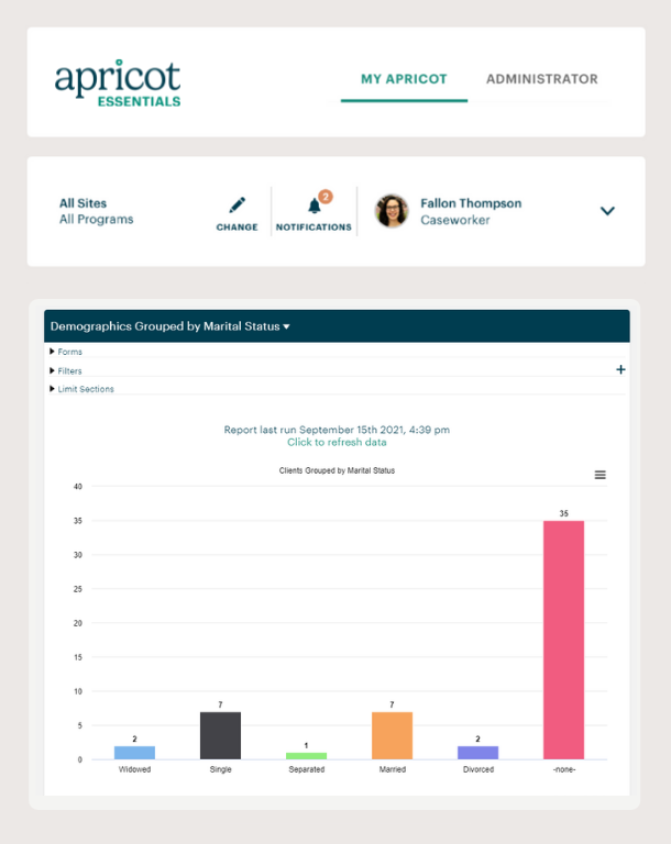 Apricot Essentials is designed to help small, efficient teams do more at a reasonable price. Essentials allows small nonprofits to collect service data, track outcomes and produce reports all from one system. Put the information you need in one place while aligning everyone in your organization with a single purpose—delivering more of your mission.
