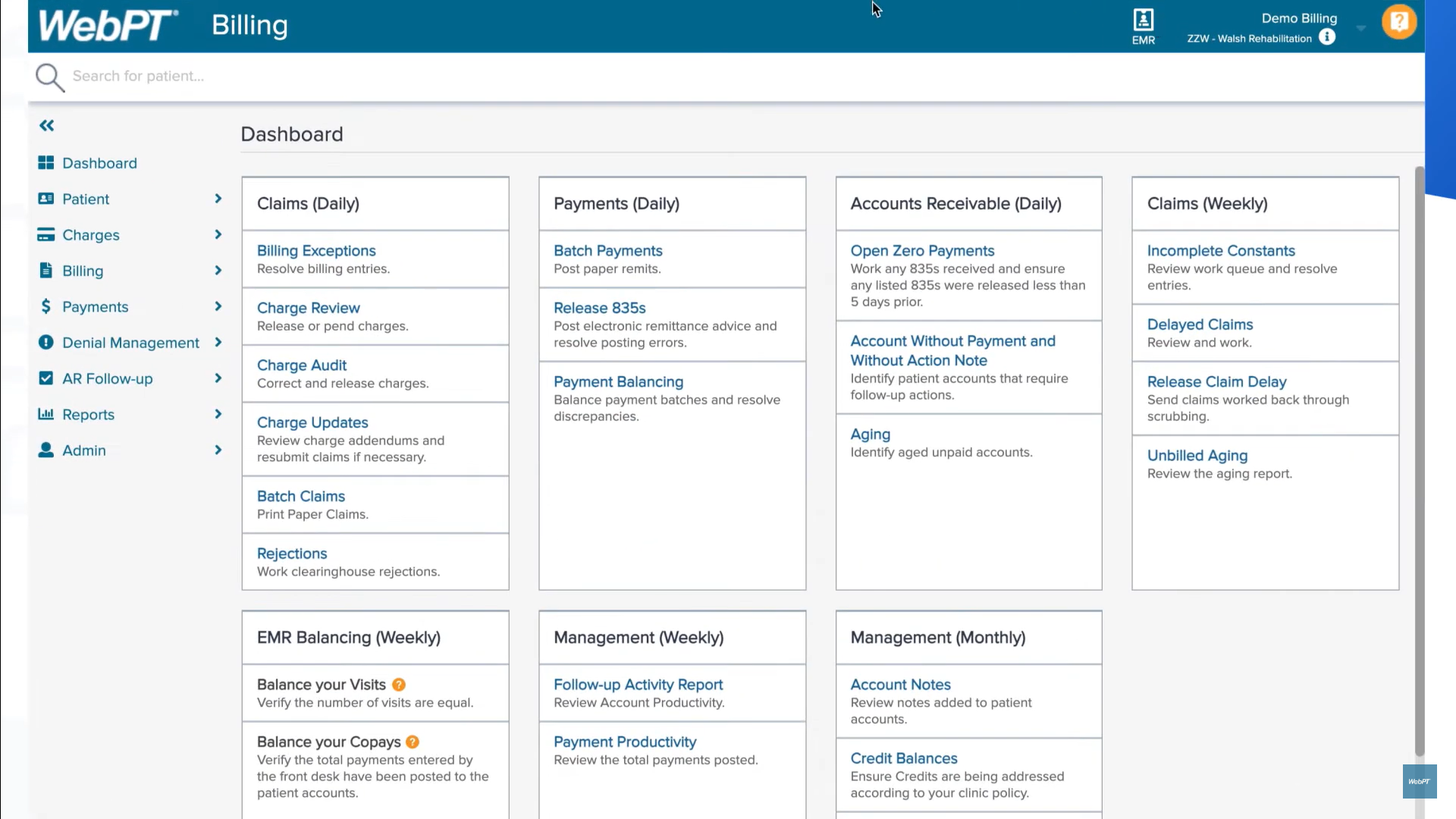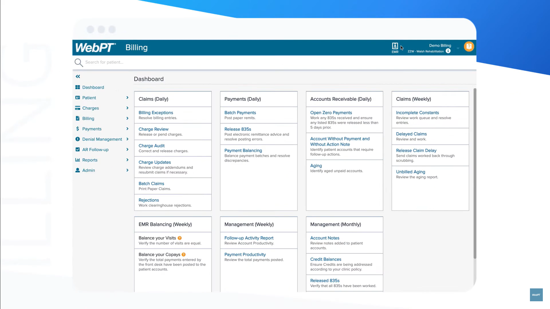 WebPT has two in-house billing solutions to choose from that offer high-quality claims scrubbing, patient payment reconciliation, and synchronized workflows that connect front office, back office, and clinical operations—helping you save time and maximize collections.