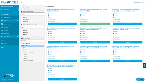 On-demand access to over 2,000 hours of accredited video content. WebPT’s interactive learning portal streamlines fulfillment of state CEU requirements across your entire therapy organization.