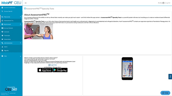 Once you earn continuing education units, you can review those training materials for life, which means you can refresh your memory on a particular course whenever, wherever, and as often as you’d like. Plus, with WebPT CEU, you can access Assessment PRO Specialty Tests, allowing you to review provocative tests you haven’t seen in years—without having to scour textbooks, journals, or the Internet.