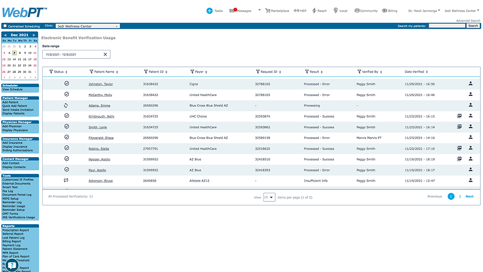 Because eBV is powered by the WebPT EMR, all insurance information is automatically transferred to the patient chart, eliminating double-data entry—and other manual errors that occur when retyping insurance information. eBV also creates usage reports that help you sort, track, and manage previously processed verification requests.